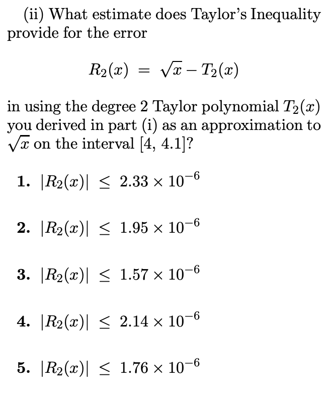 Solved Ii What Estimate Does Taylor S Inequality Provide Chegg Com